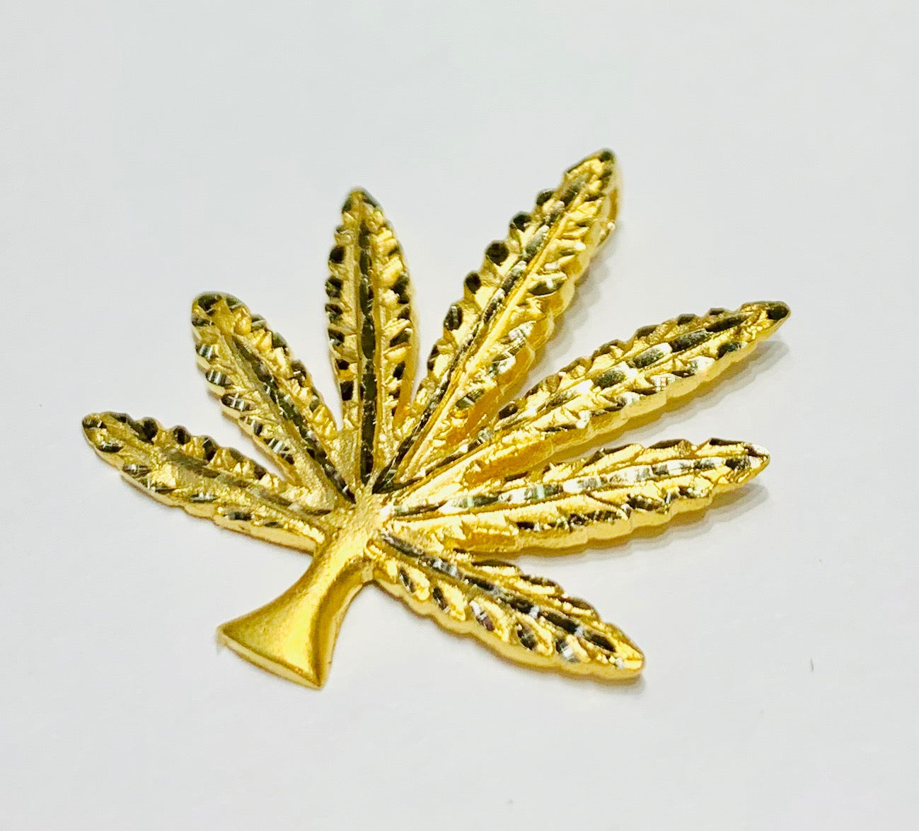 This pendant features an intricate detailing of a single leaf from the Indica cultivar of cannabis.