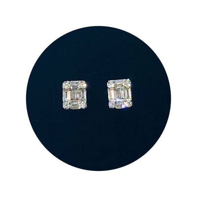 Pictured in the middle is a pair of unisex solitaire earrings with a round diamond and high polished yellow gold basket 4 prong setting