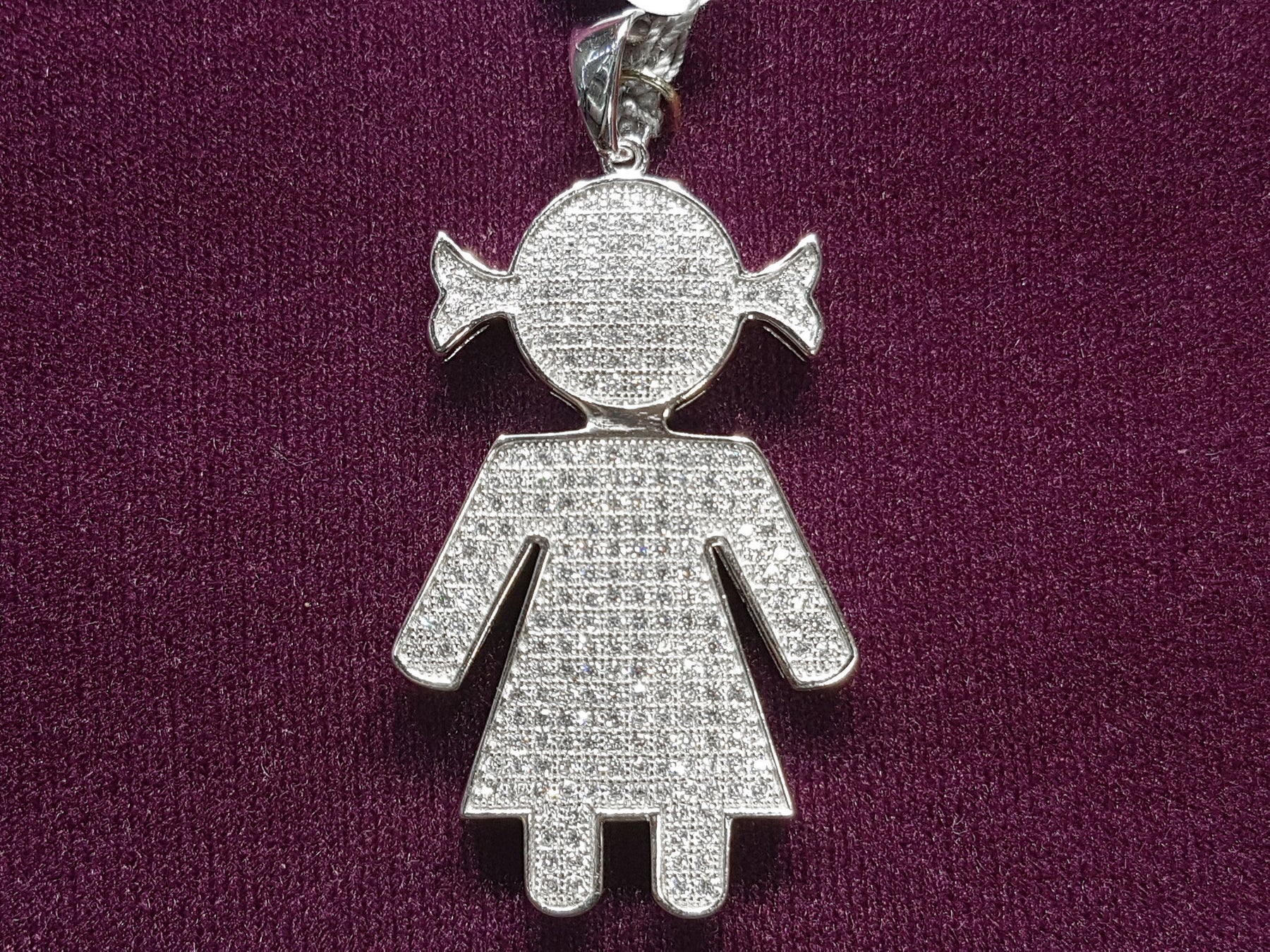This silver pendant features the widely known and conventional icy silhouette of a girl in pigtails. An adorable accessory to a chain, keychain, or even bathroom door. Alternate interpretations of this pendant may include: Pig-tailed Scotsman in a kilt, Siamese duck, Britney Spears in her famous music video, "Hit Me Baby One More Time"
