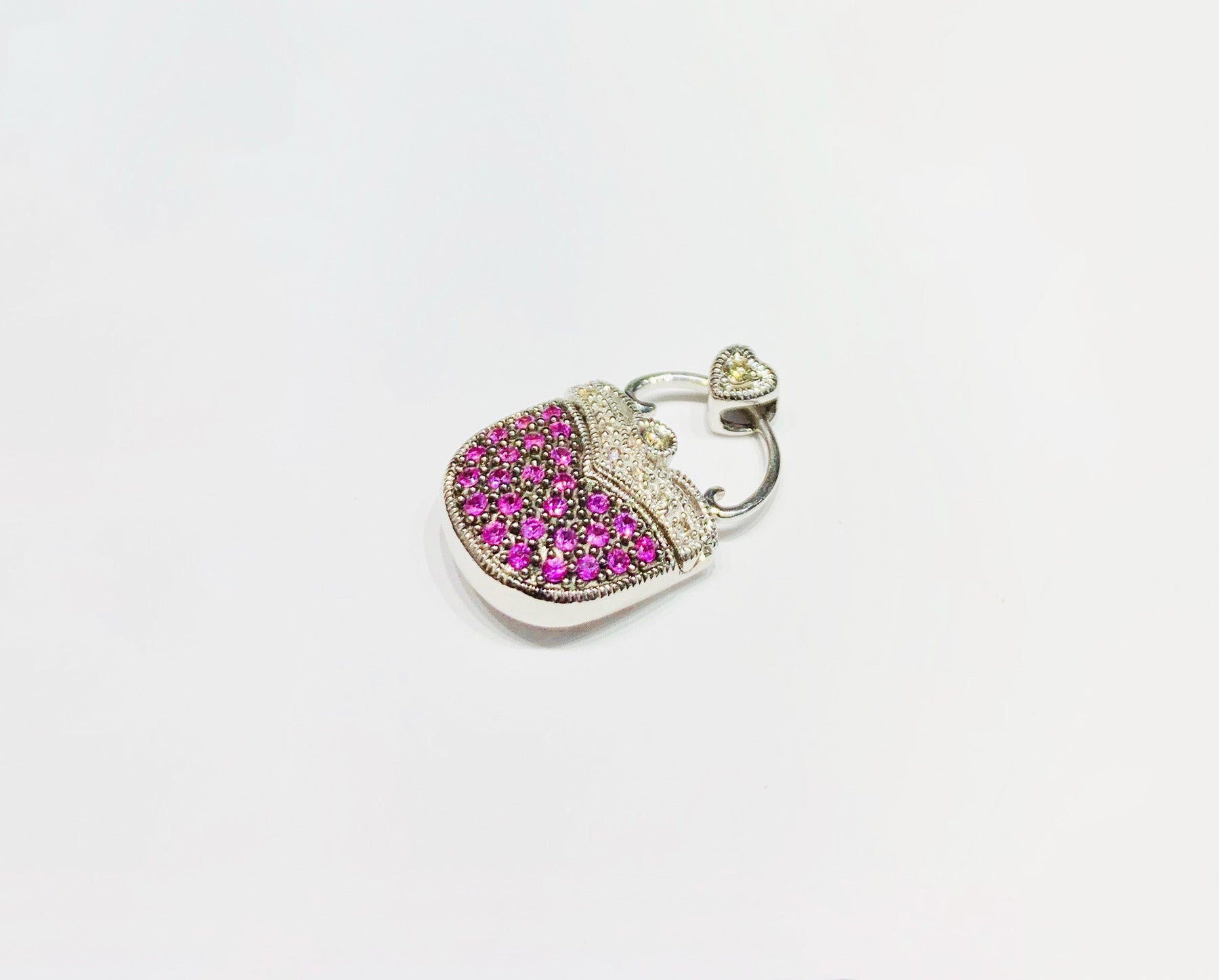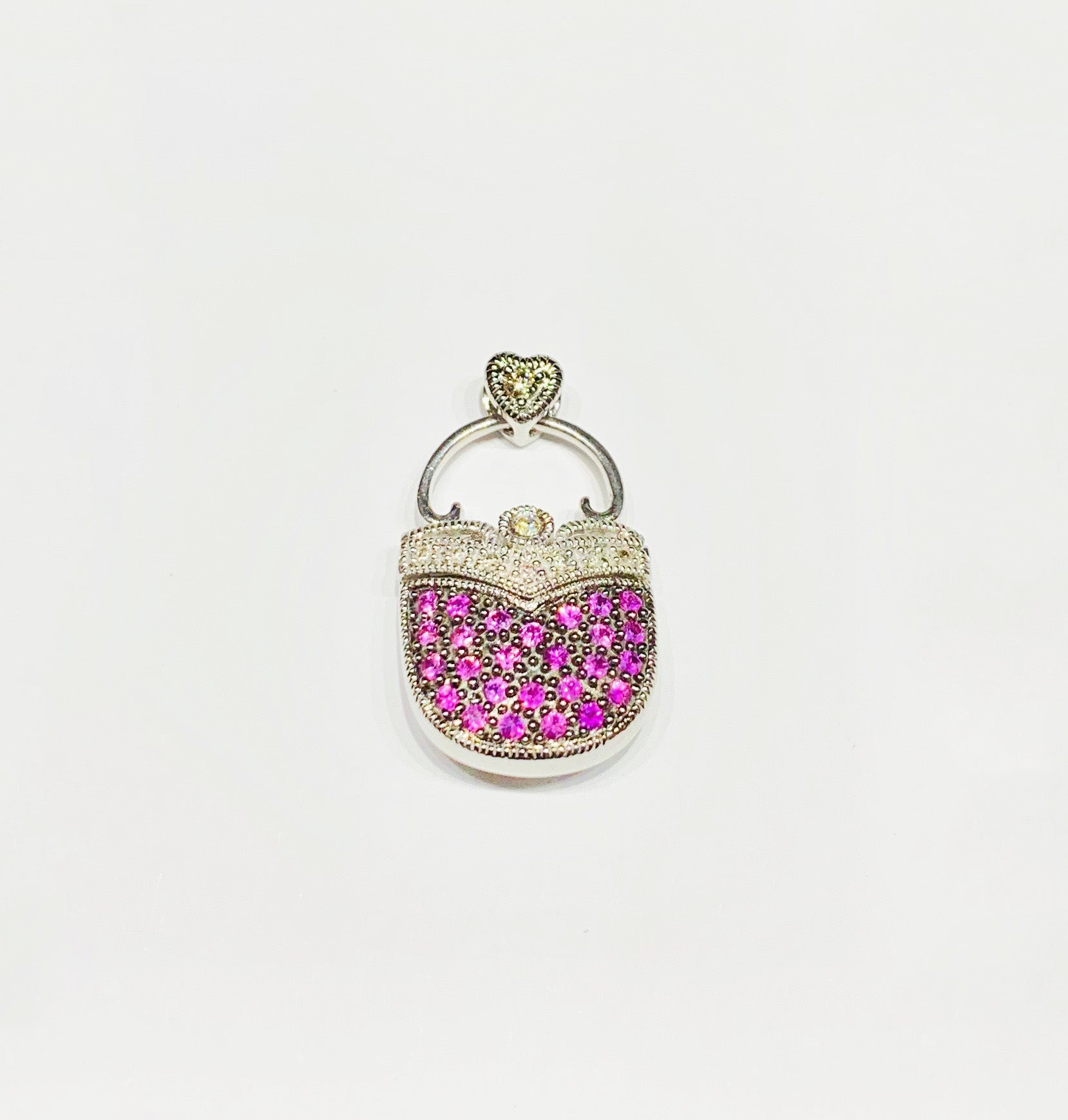 This is a beautiful Lady Bag Pendant with White diamonds and pink sapphire.