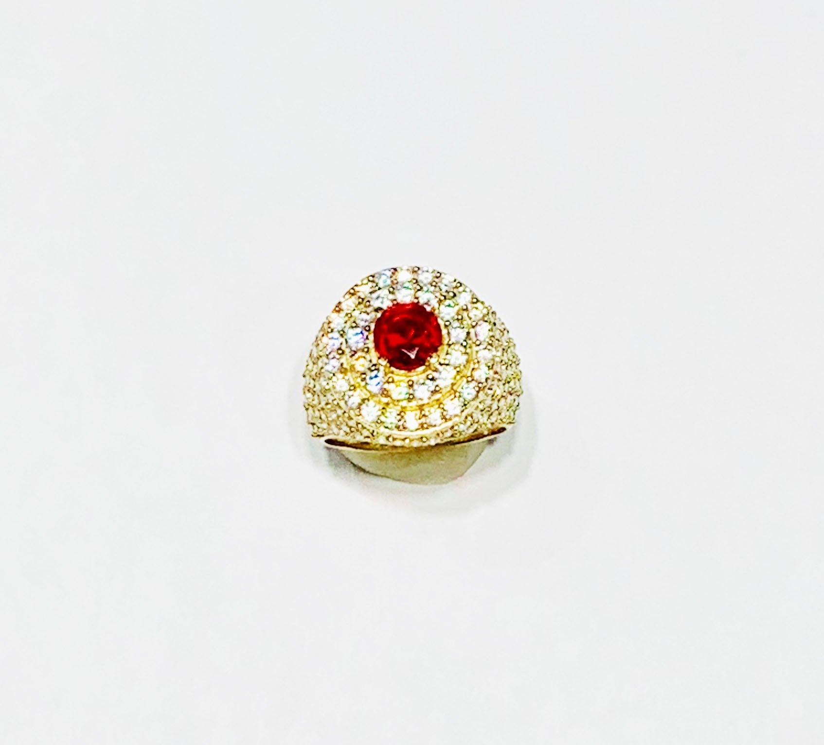 This is a yellow ring with cubic zirconia and a beautiful red stone in the middle.