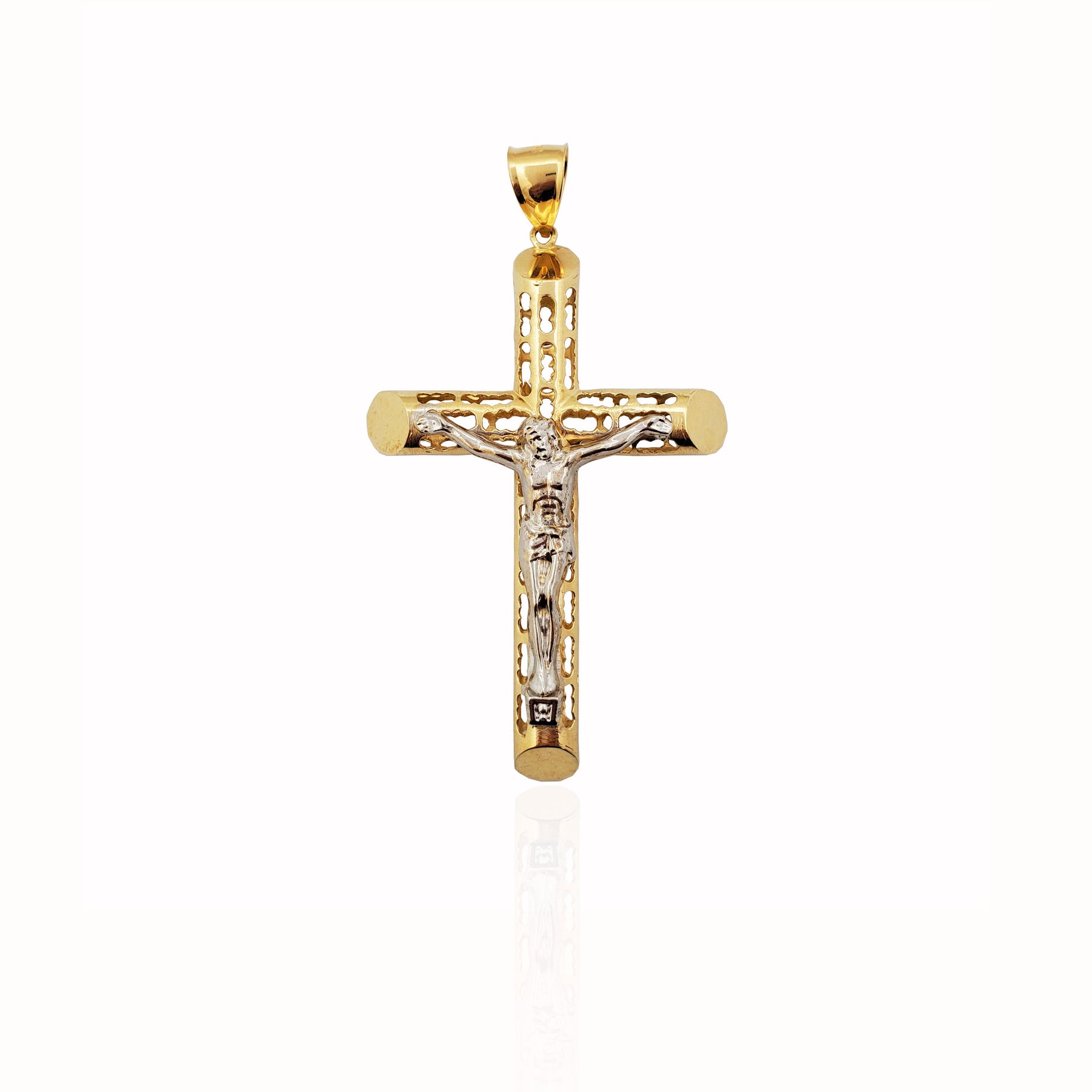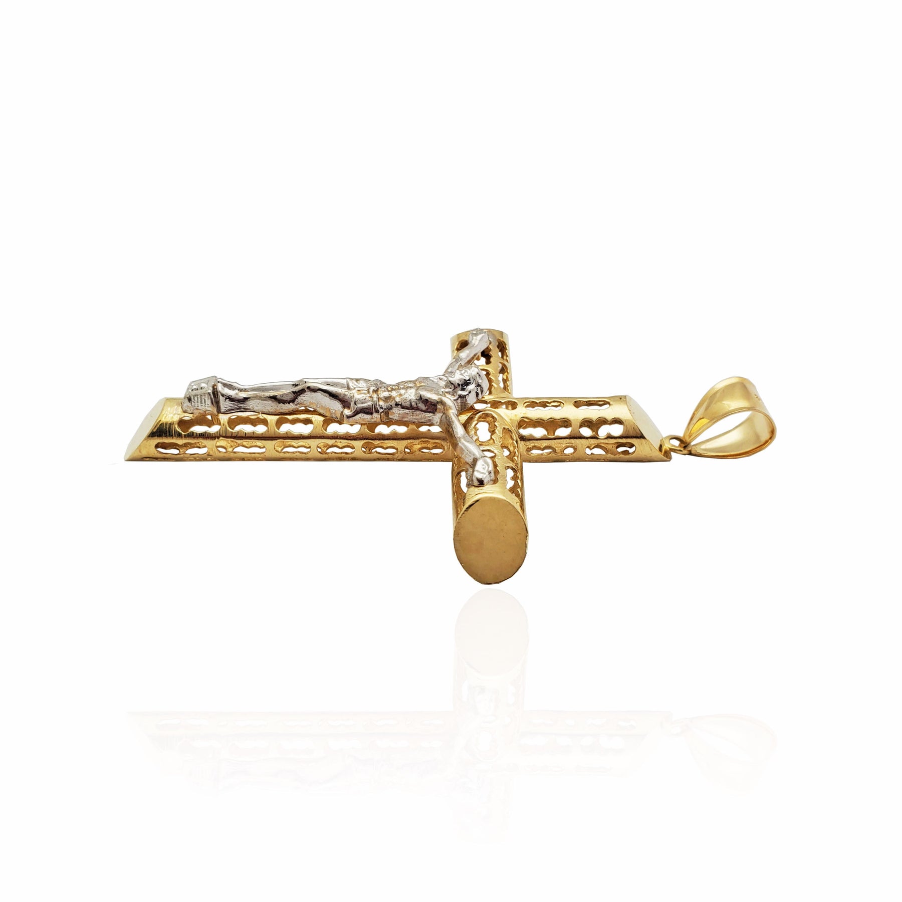A thick sheet of patterned gold is intricately woven into a cross. A white-golden Jesus is mounted upon the center of the piece.