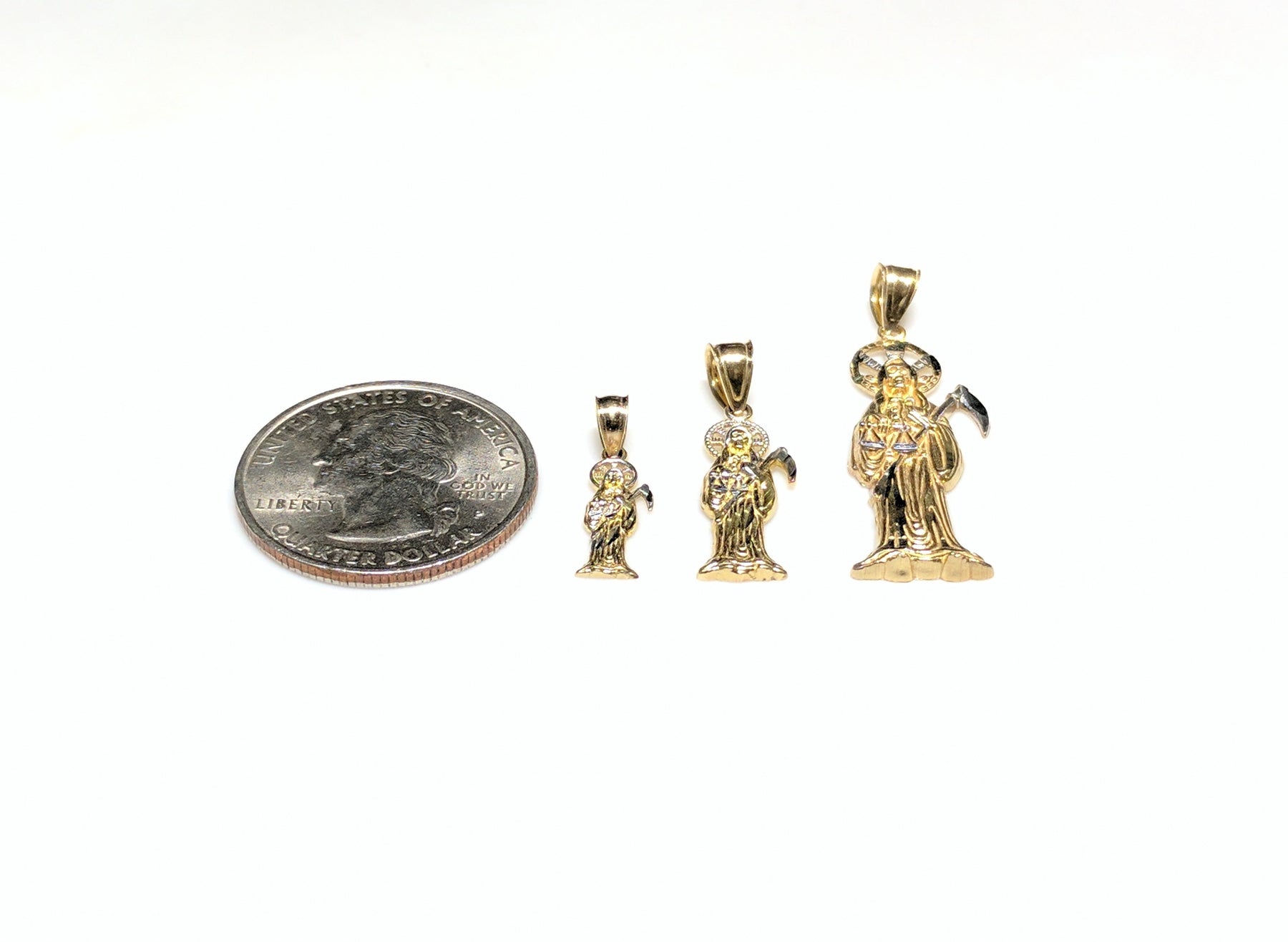 This pendant features a gold adaptation of Santa Muerte, the Latin patron saint of the oppressed. The headdress, scales, and scythe are accentuated with white gold.