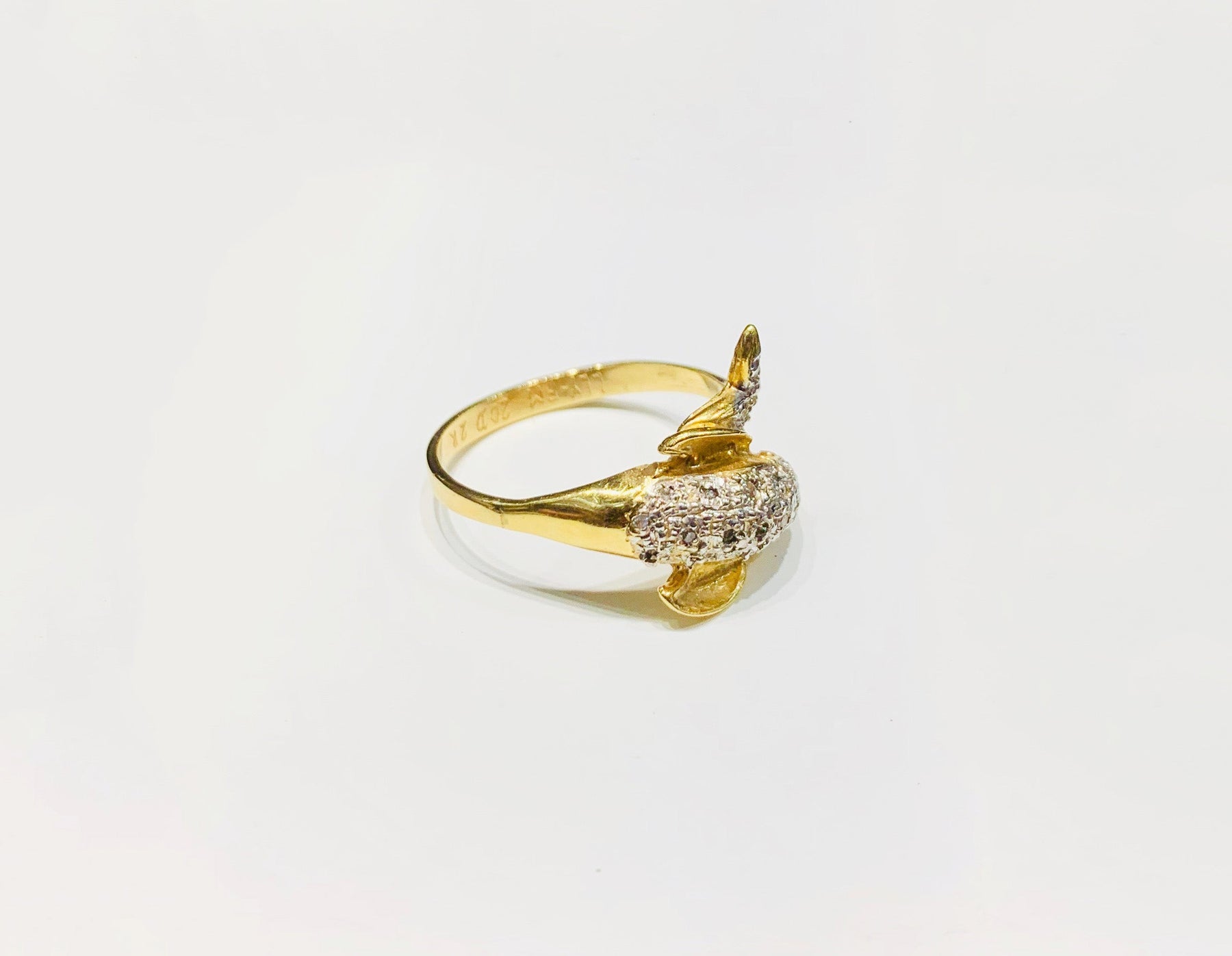 An adorable dolphin motion ring featuring a spinnable round cubic zirconia stone held by its tail and a red cubic zirconia stone in the eye of this beloved animal.
