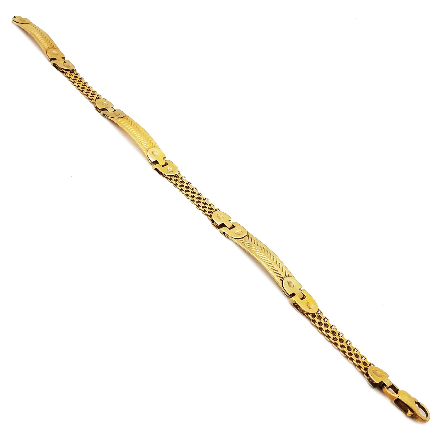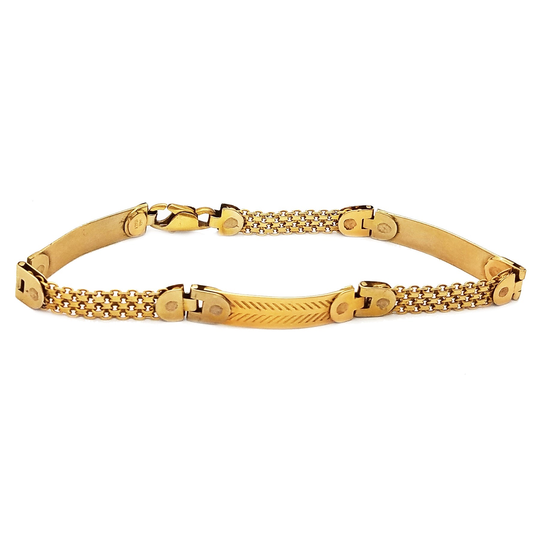 This is a Mesh/Solid Yellow Gold Bracelet (14K) made with pure solid gold. This bracelet was designed to be simple yet unique in its kind. It combines a mesh design with solid pieces of yellow gold to provide a comfortable, flexible and astonishing style for those who wear it.