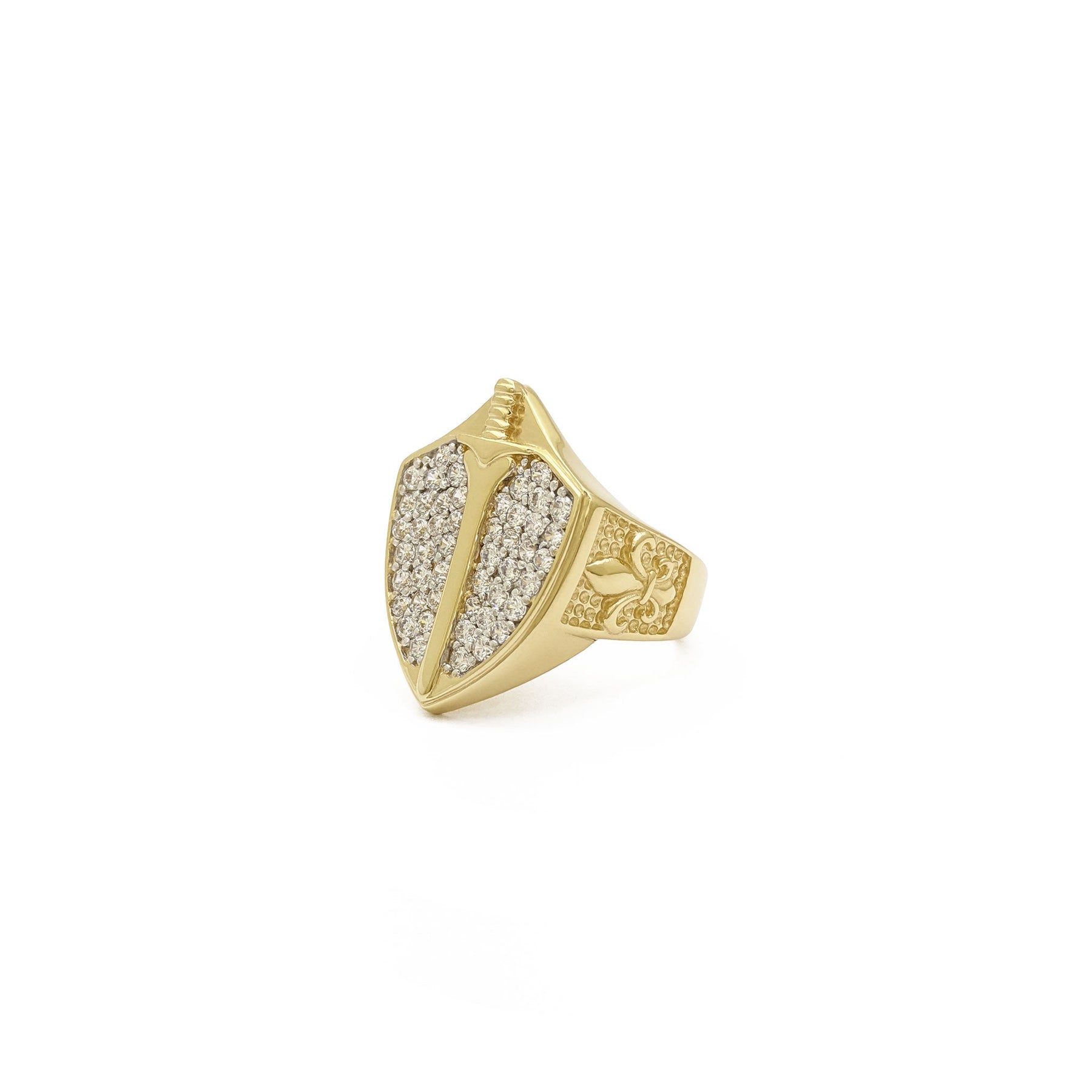 A fully iced shield with a downward-facing sword compose this elegant ring featuring a Fleur-de-lis symbol on each side of the band. Holes patterns are incorporated behind the royal symbol on the sides to provide a sense of depth while enhancing the overall look of the ring.