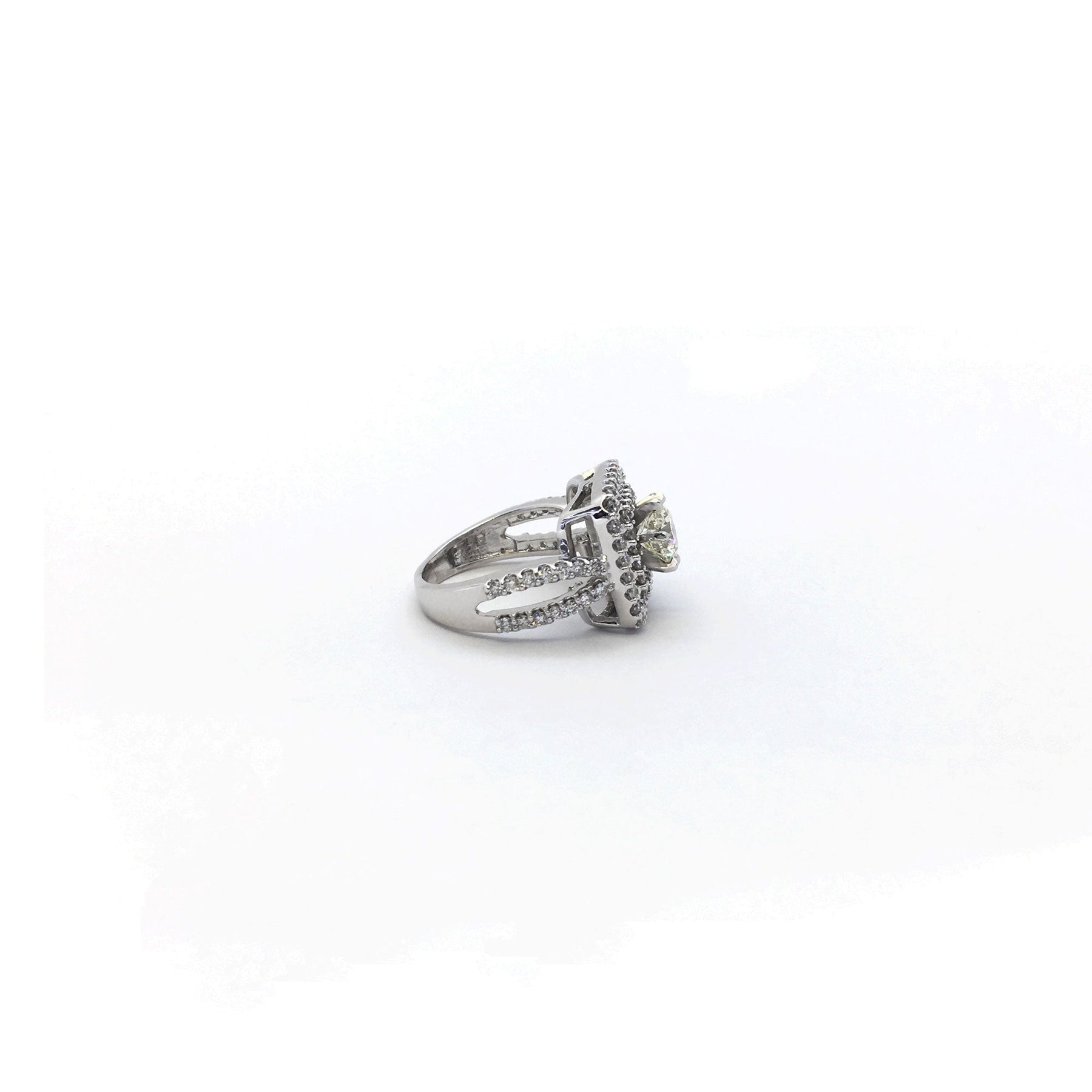 Two rows of diamond halos surround a round diamond in this impressively gleaming engagement ring with interlaced shiny sides.