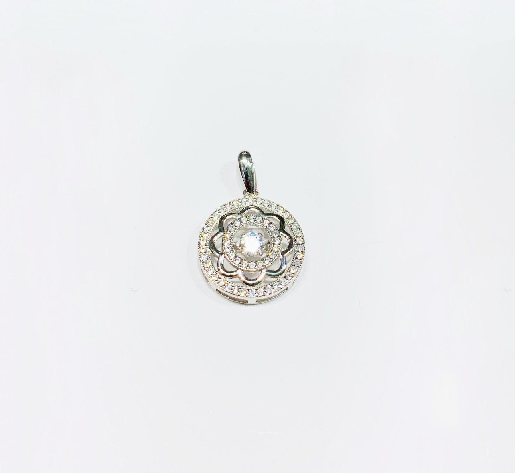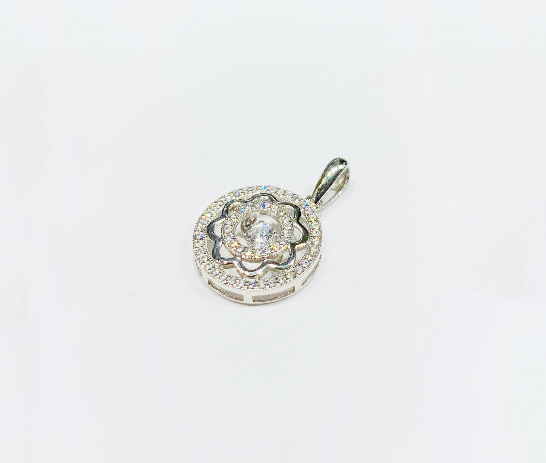 This is a Round Flower Pendant with cubic zirconia stones.
