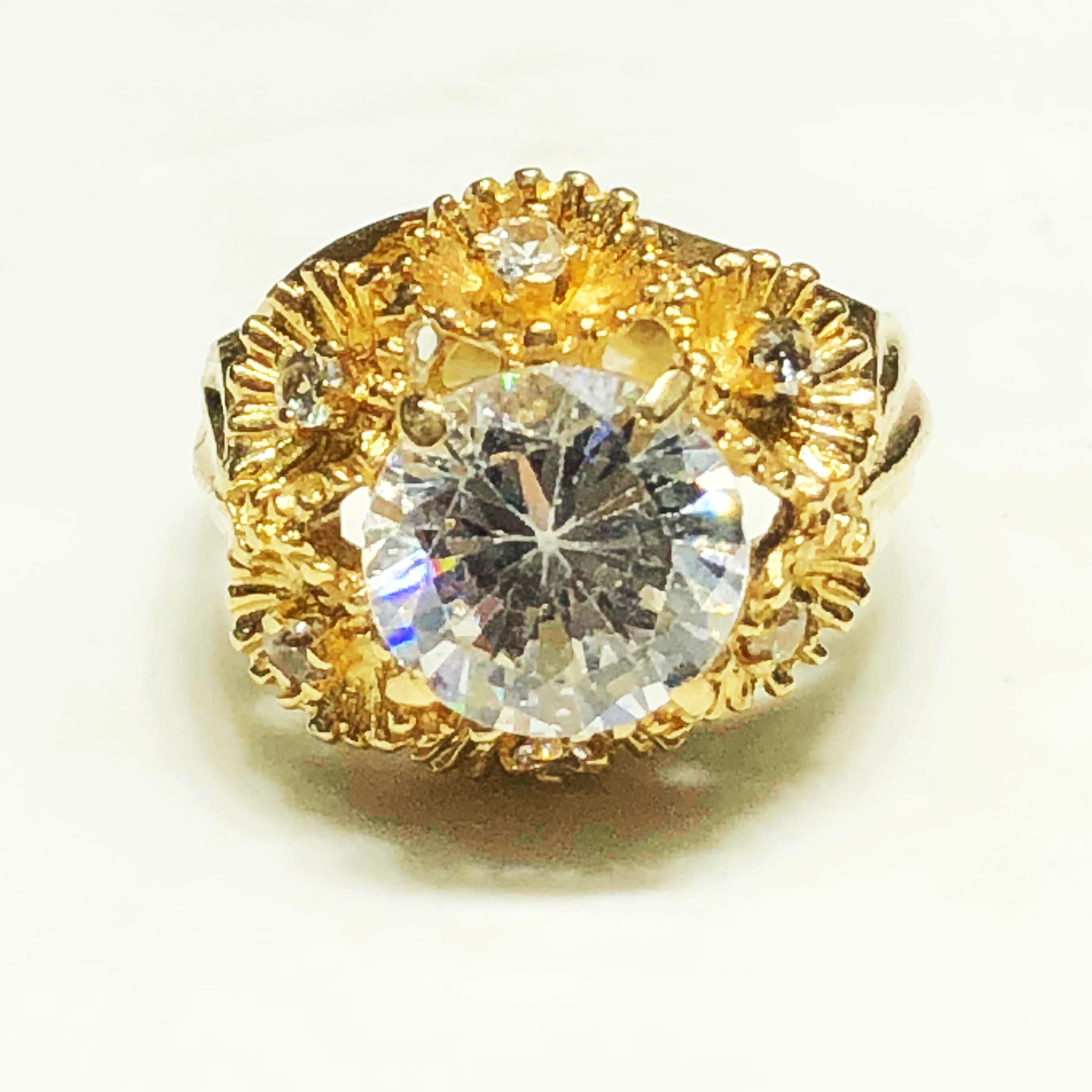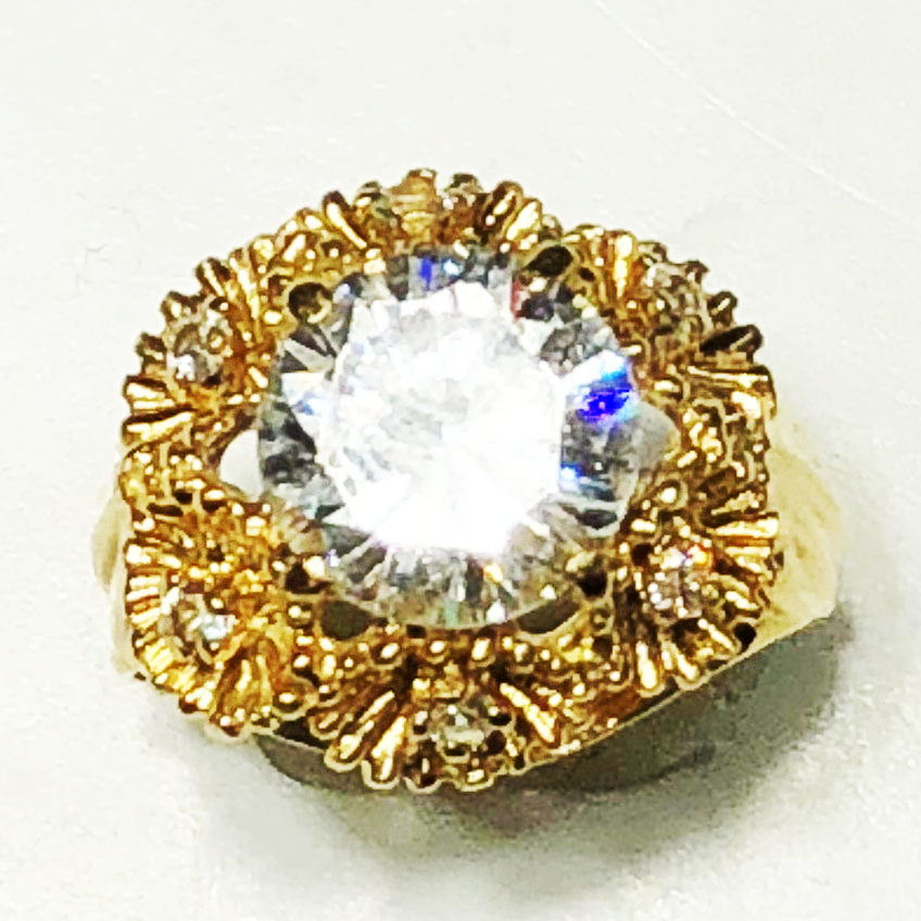 This ring features a voluptuous round center stone surrounded by golden floral arrangements