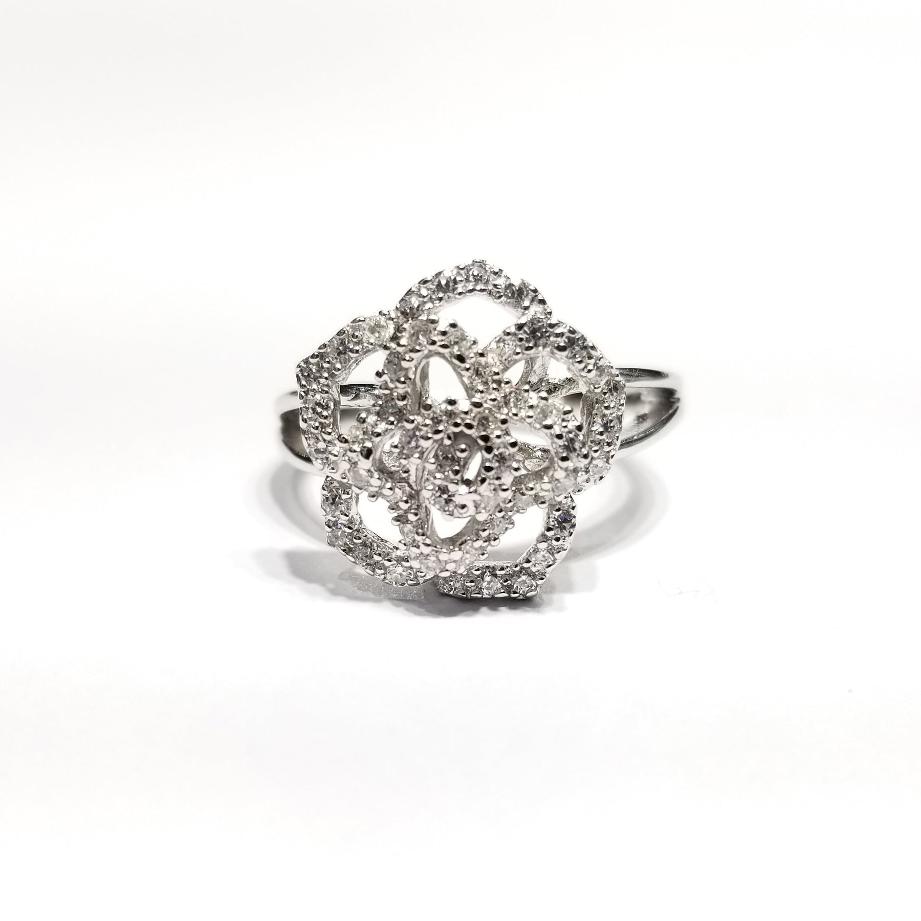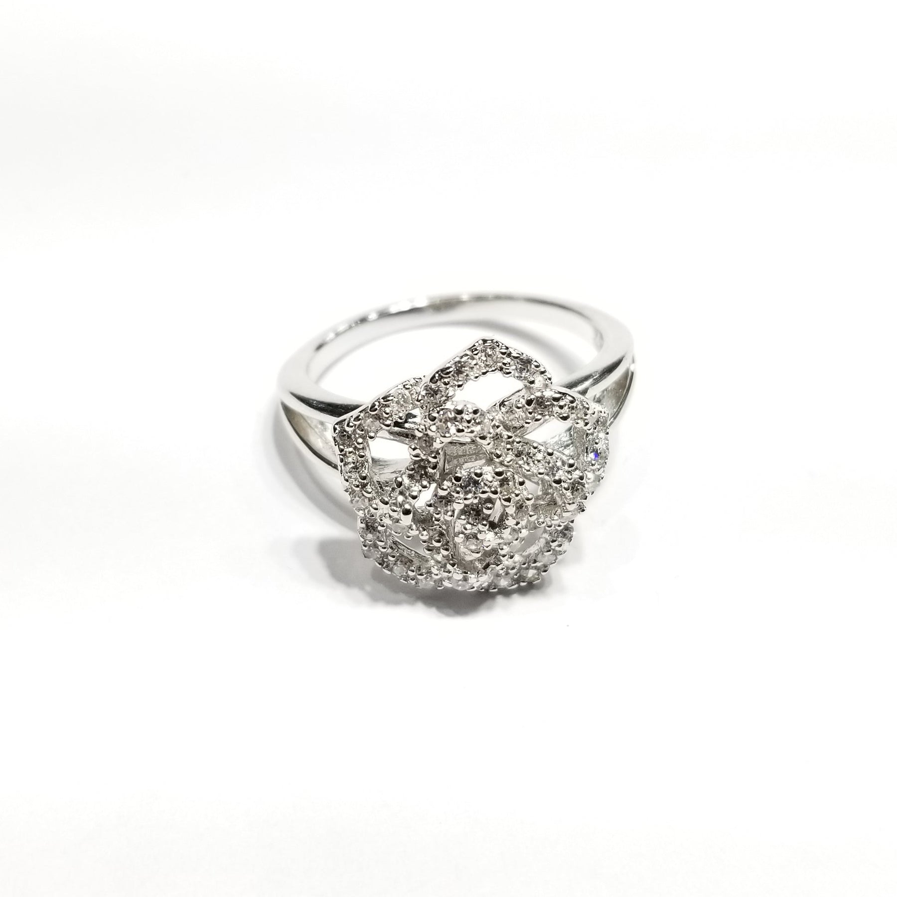 This is a brilliant rose outline ring made out of zirconia stones.