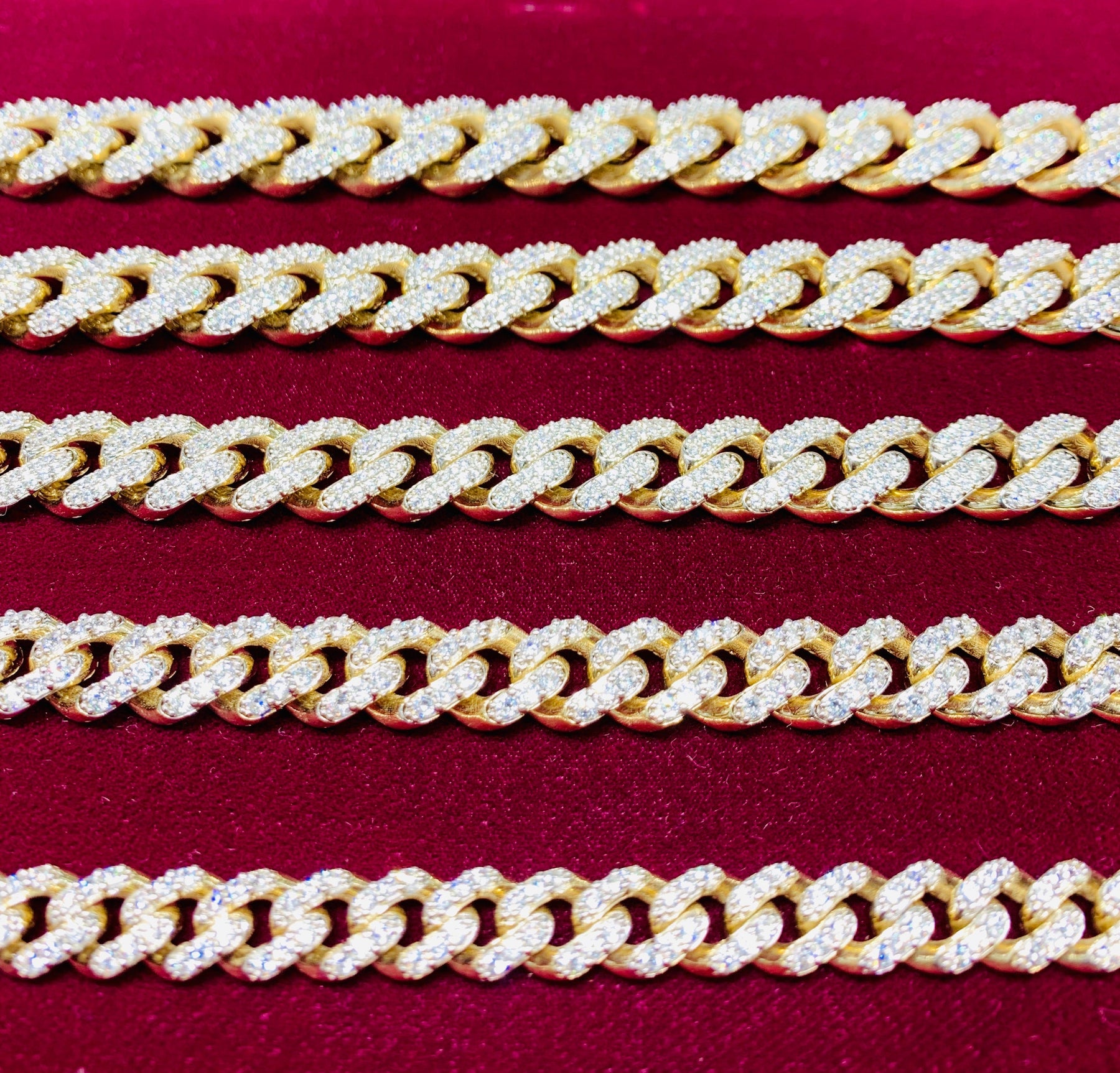 The ice-cold, unforgivably blingy cousin of the Miami-Cuban link Bracelet decorated with high quality diamonds. Wearing this extravagant Bracelet is but one of the many ostentatious methods to show off your wealth and high taste.