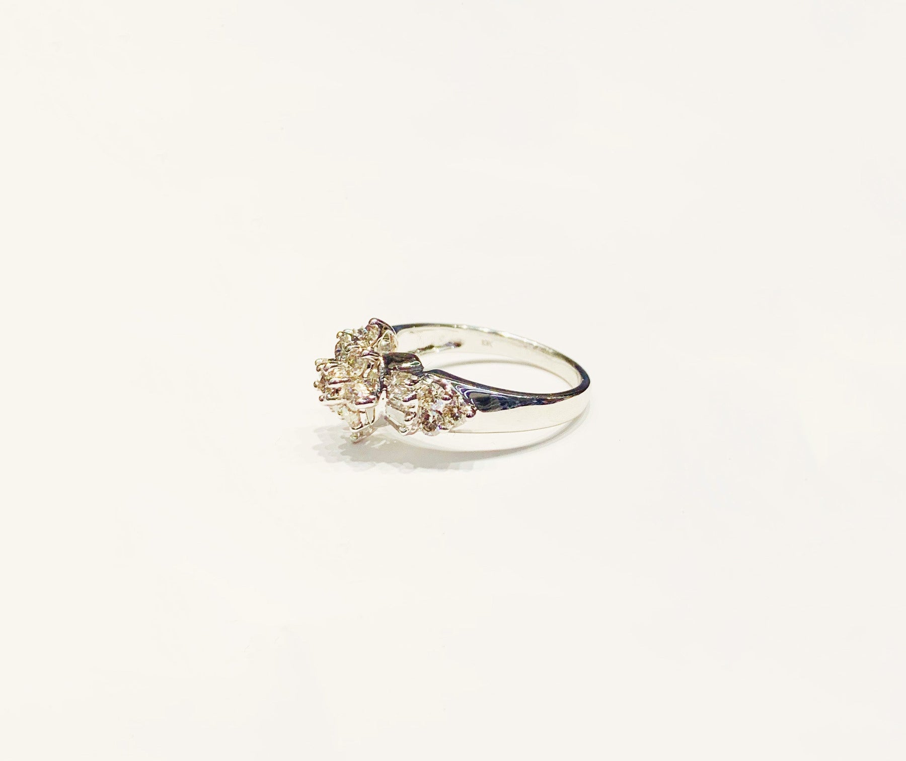Este es un anillo de flores brillantes con piedras de diamantes blancos.