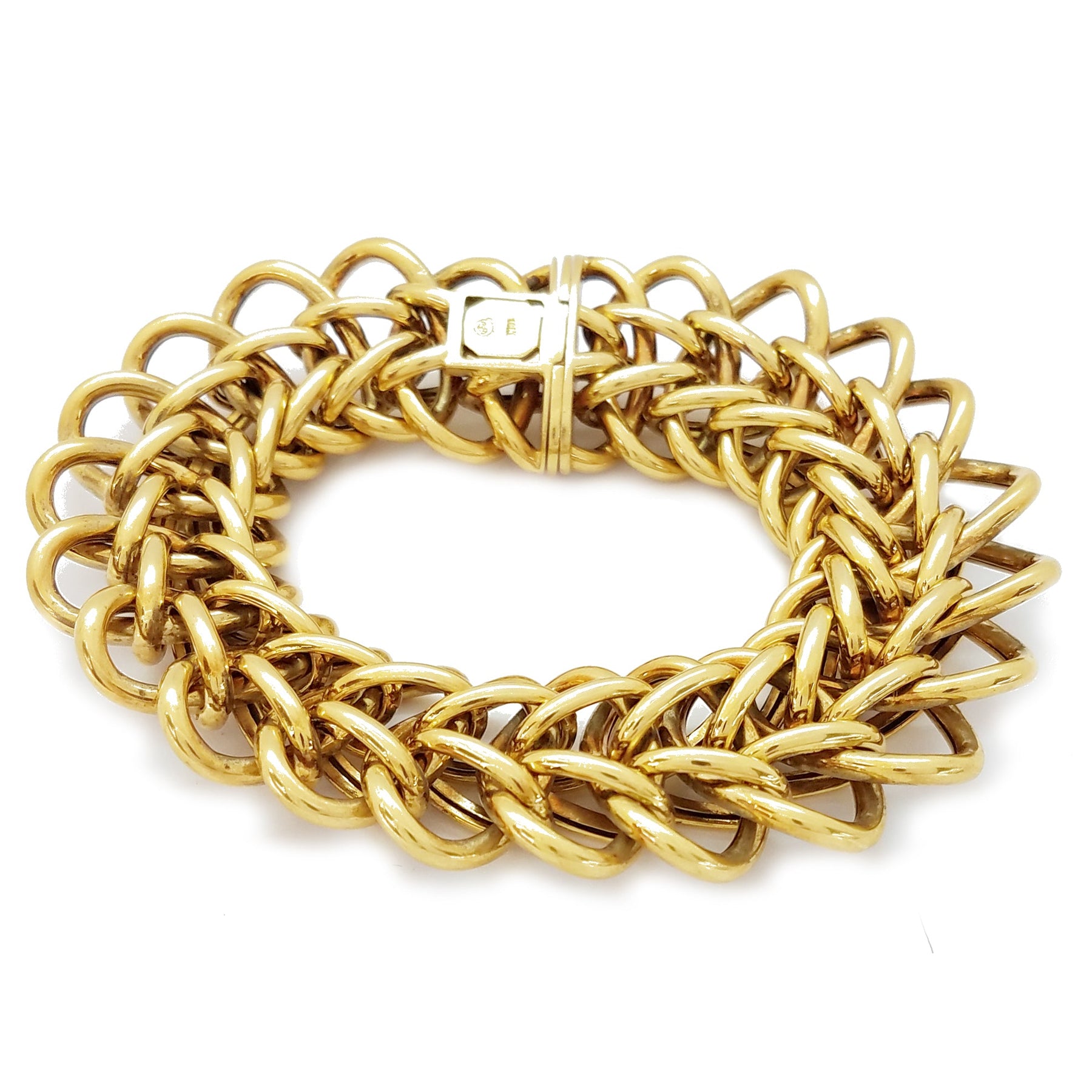 • Metal precioso: Oro amarillo de 18 quilates • Piedra preciosa: Ninguna • Tamaño: - Longitud: 8 pulgadas - Ancho: 24 mm - Espesor: 8,5 mm - Peso: 59,8 gramos