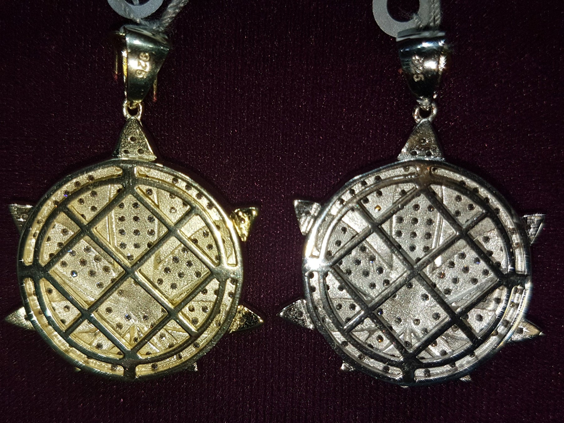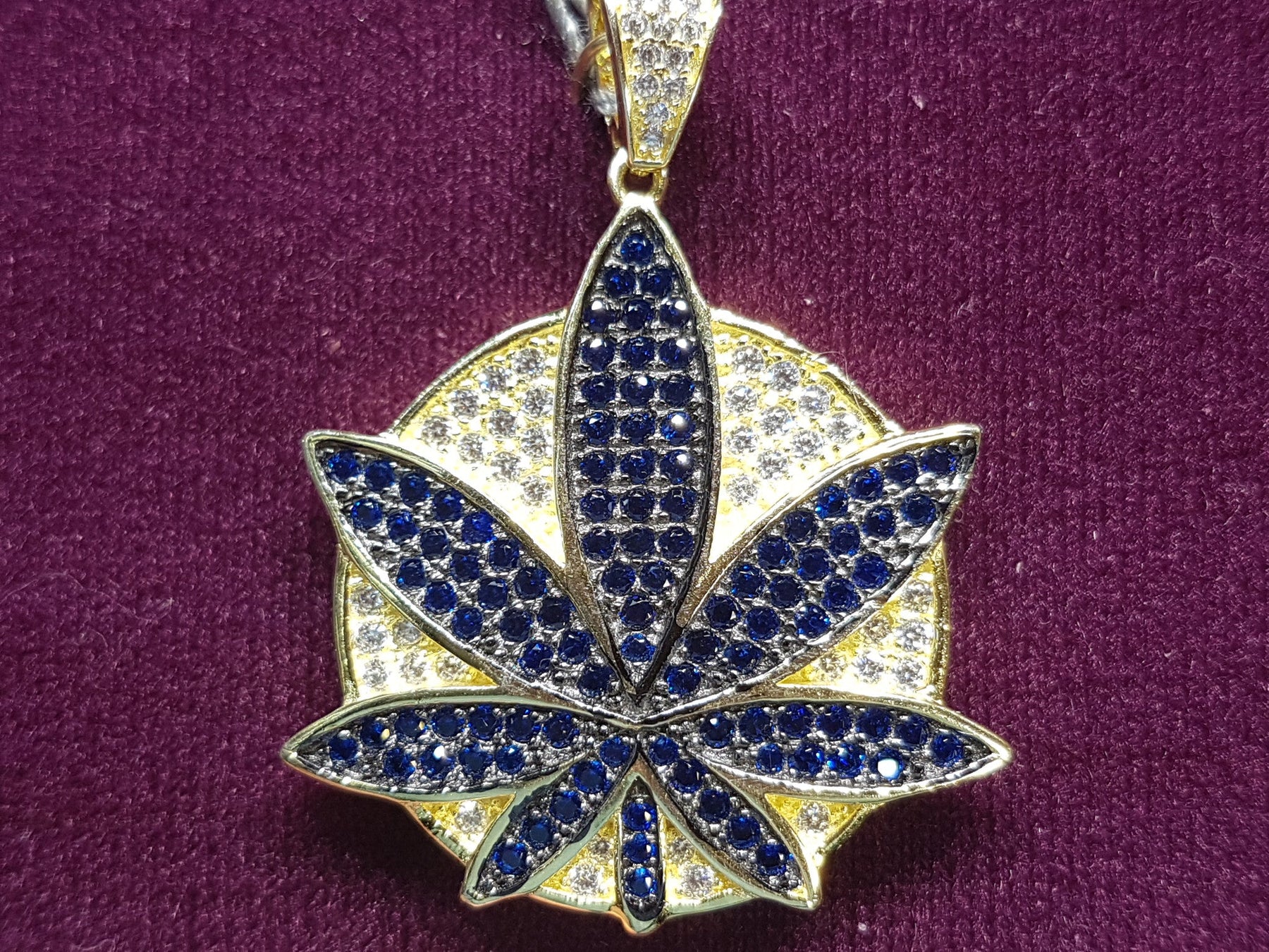 Este colgante presenta una hoja de cannabis que sobresale entre las costuras del medallón. Los colores vienen en una gran variedad de colores helados.