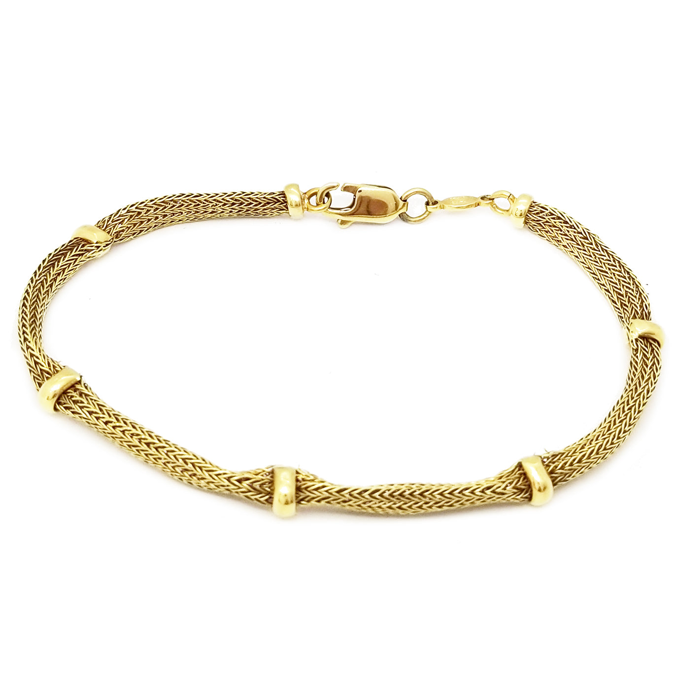 Esta pulsera de cuerda con nudos en oro amarillo (14 quilates) es perfecta para mujeres que desean lucir una elegante pulsera de malla transparente. Esta obra de arte sin duda cautivará la atención de muchos por su estilo único y su color oro amarillo.