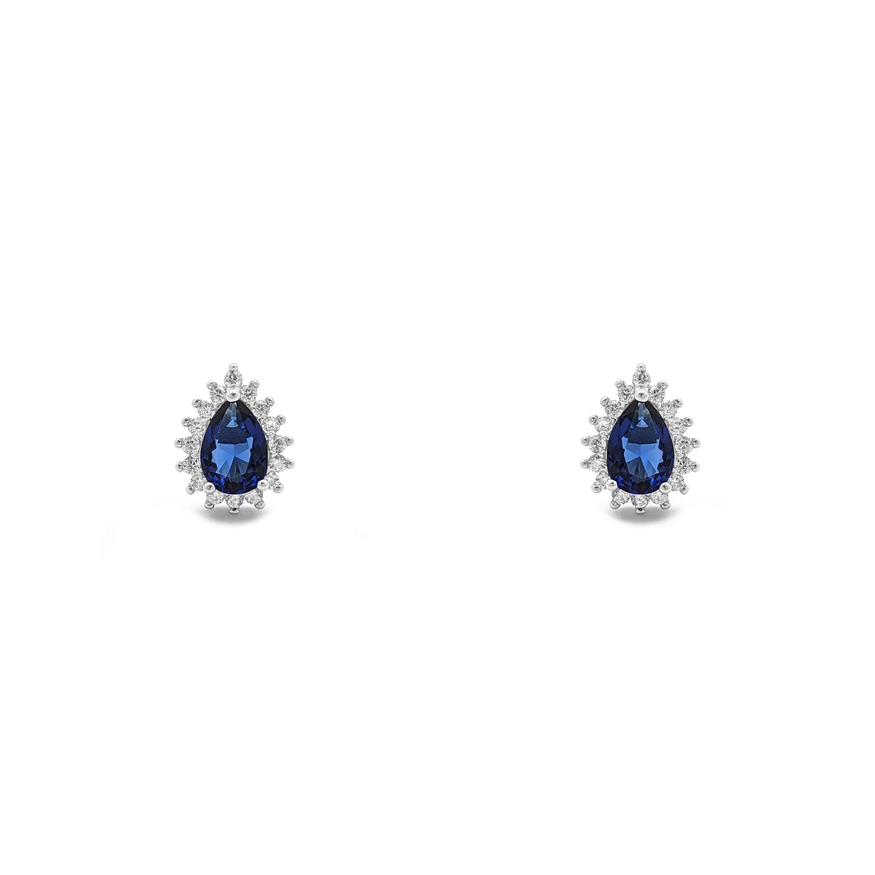 Blue Stone Teardrop Halo Stud Earrings (Silver) front - Lucky Diamond - New York