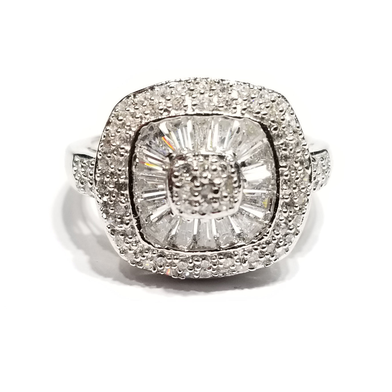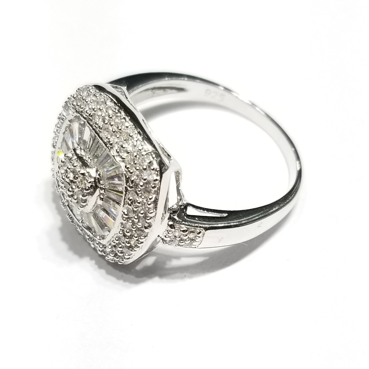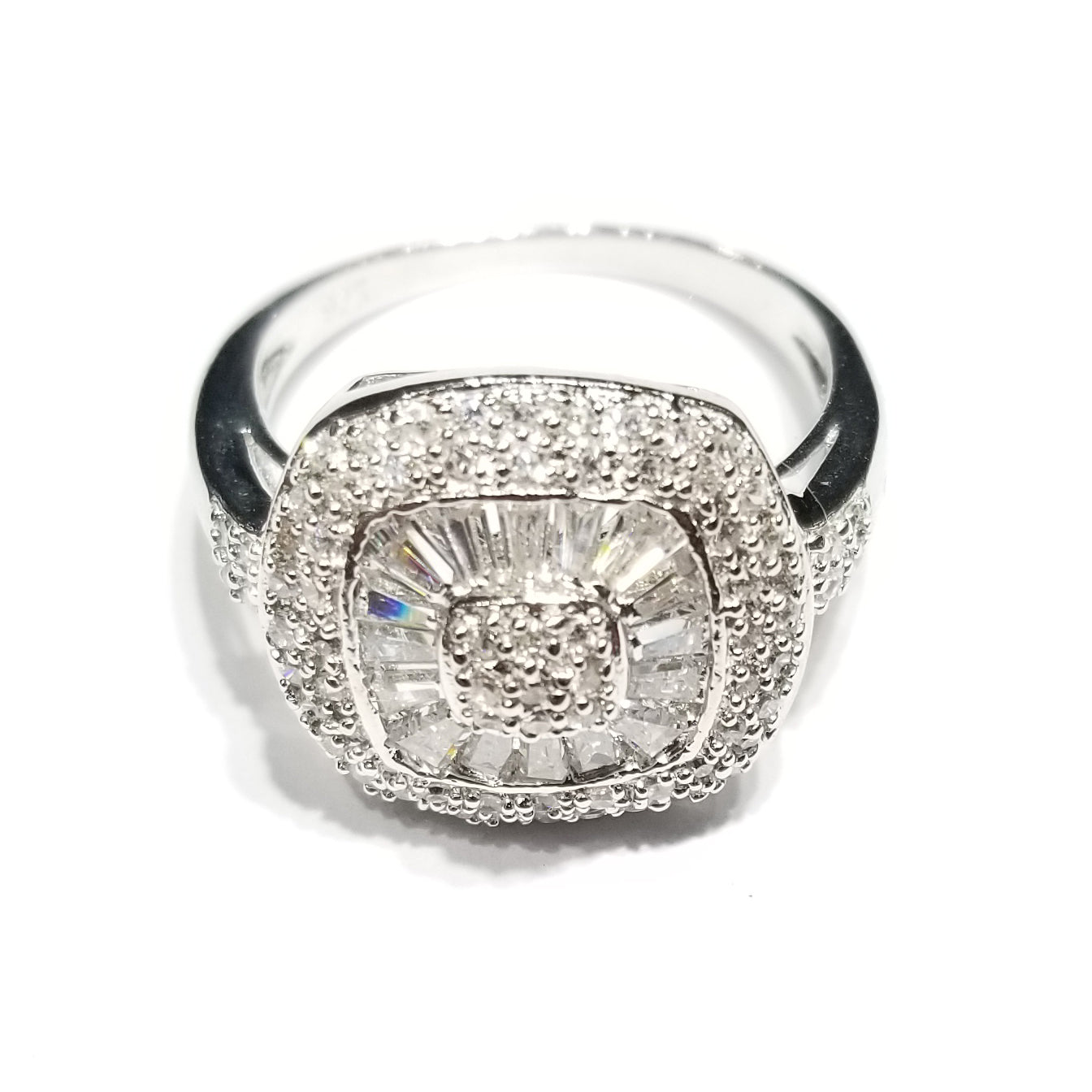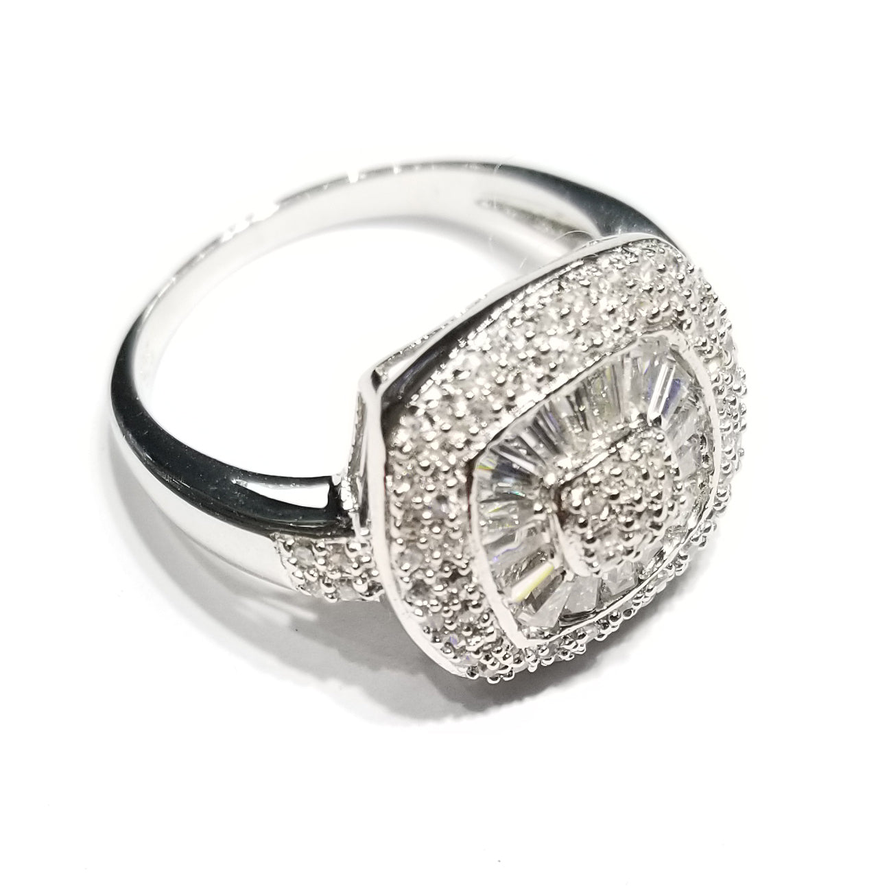 Este es un anillo de corte cuadrado brillante con piedras de circonita cúbica.
