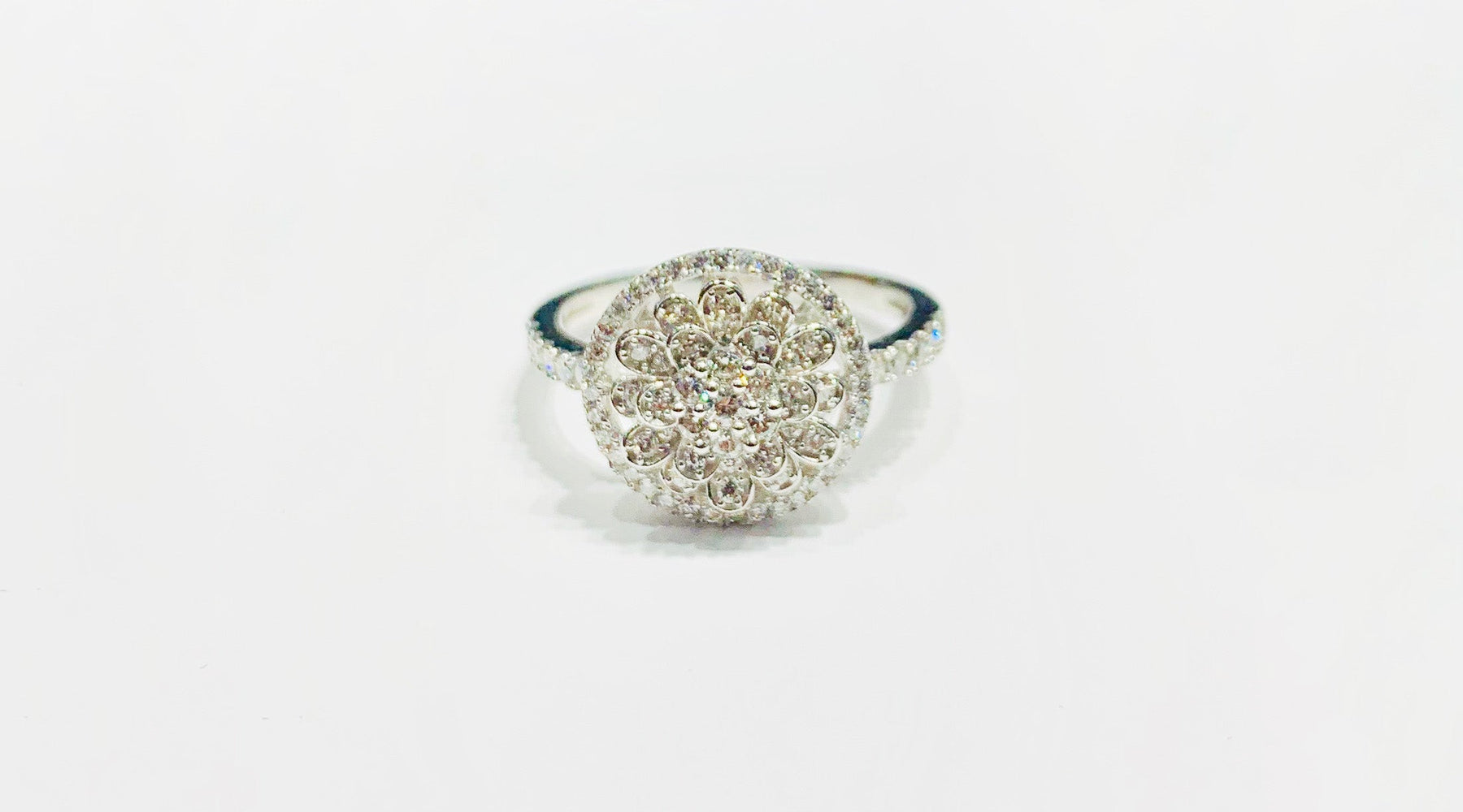 Este es un anillo de flores redondo brillante con diamantes blancos.