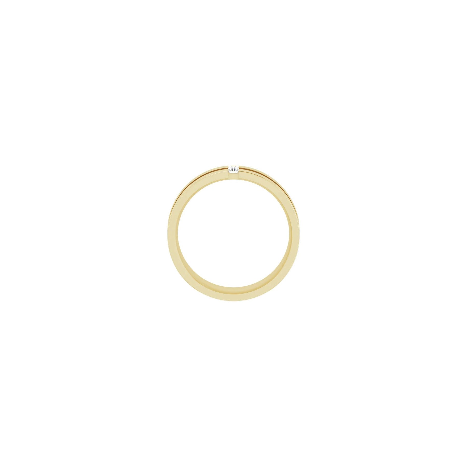 Setting view of a 14k yellow gold notched ring featuring a vertically set white straight baguette diamond in the center