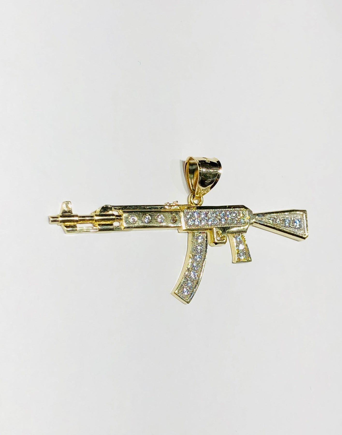 Este es un colgante de rifle Ak47 con piedras de circonita cúbica.