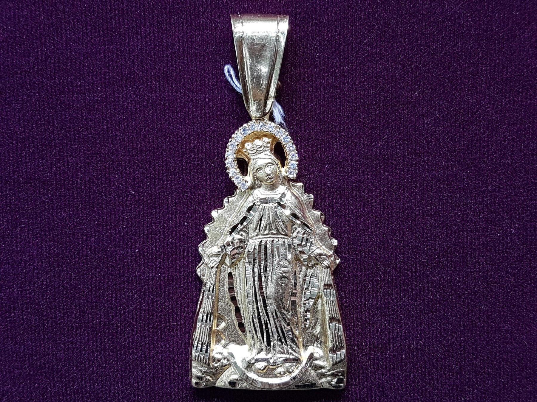 La santa patrona de Cuba en forma de colgante con halo de circonitas cúbicas.